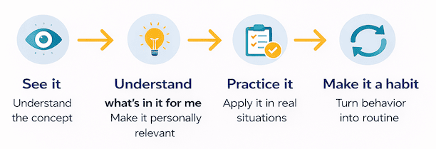 行動変容は、一度の学びではなく、振り返りと実践を重ね、定着させるプロセスの中で生まれます。