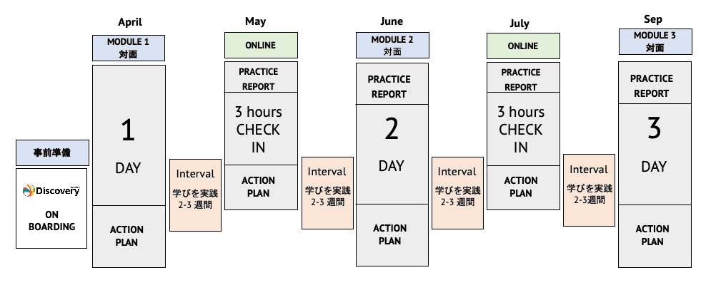 対面トレーニングの合間には、行動変容と持続的なリーダーシップの成果を確実にするために、実践・振り返りフェーズが設けられています。